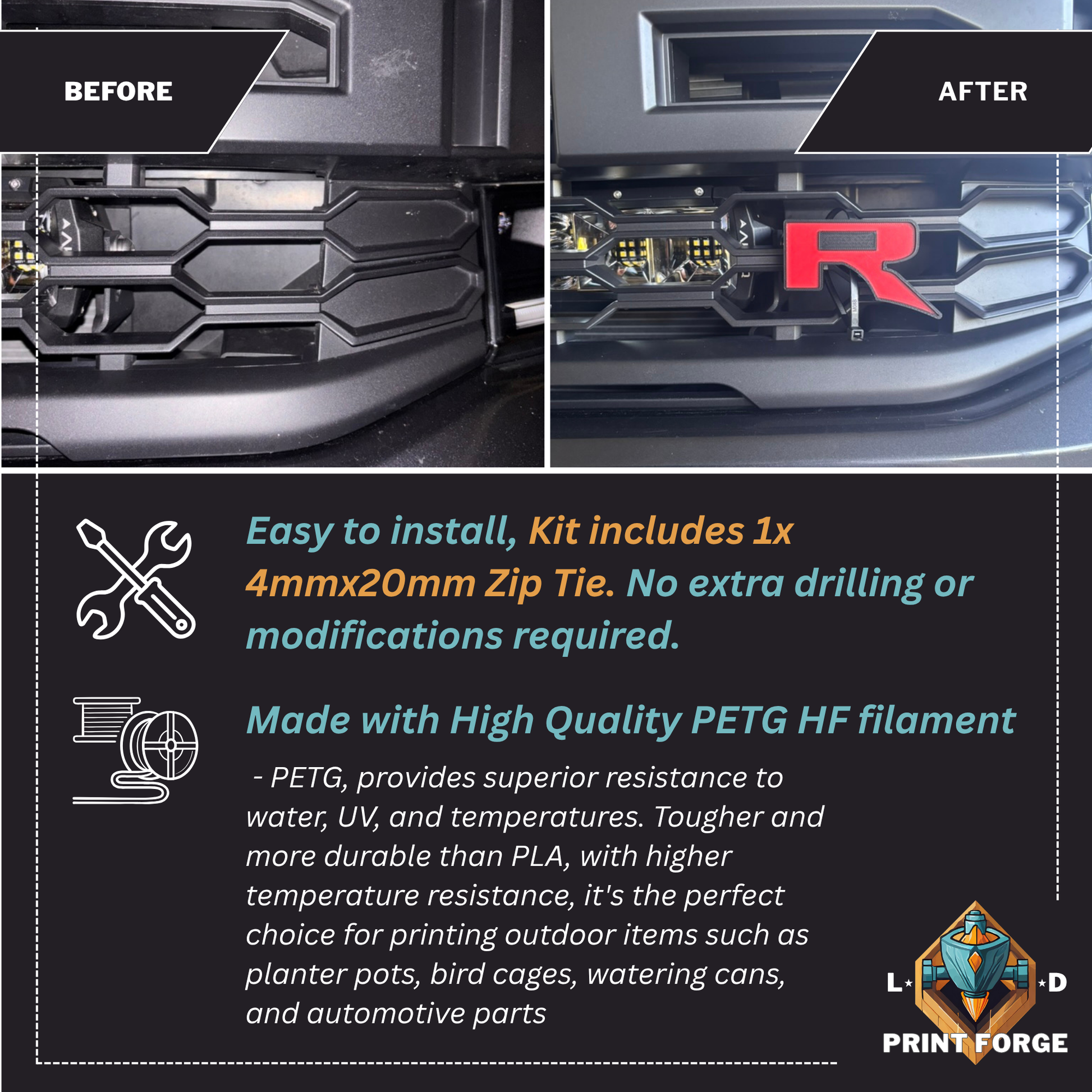 Manufactured from high-quality PETG plastic, this emblem is lightweight, UV-resistant, and built to withstand harsh driving conditions. Reinforced cable-tie mounting points provide a secure hold, while the felt-lined rear backing protects your grille from scratches or wear during installation and everyday use.