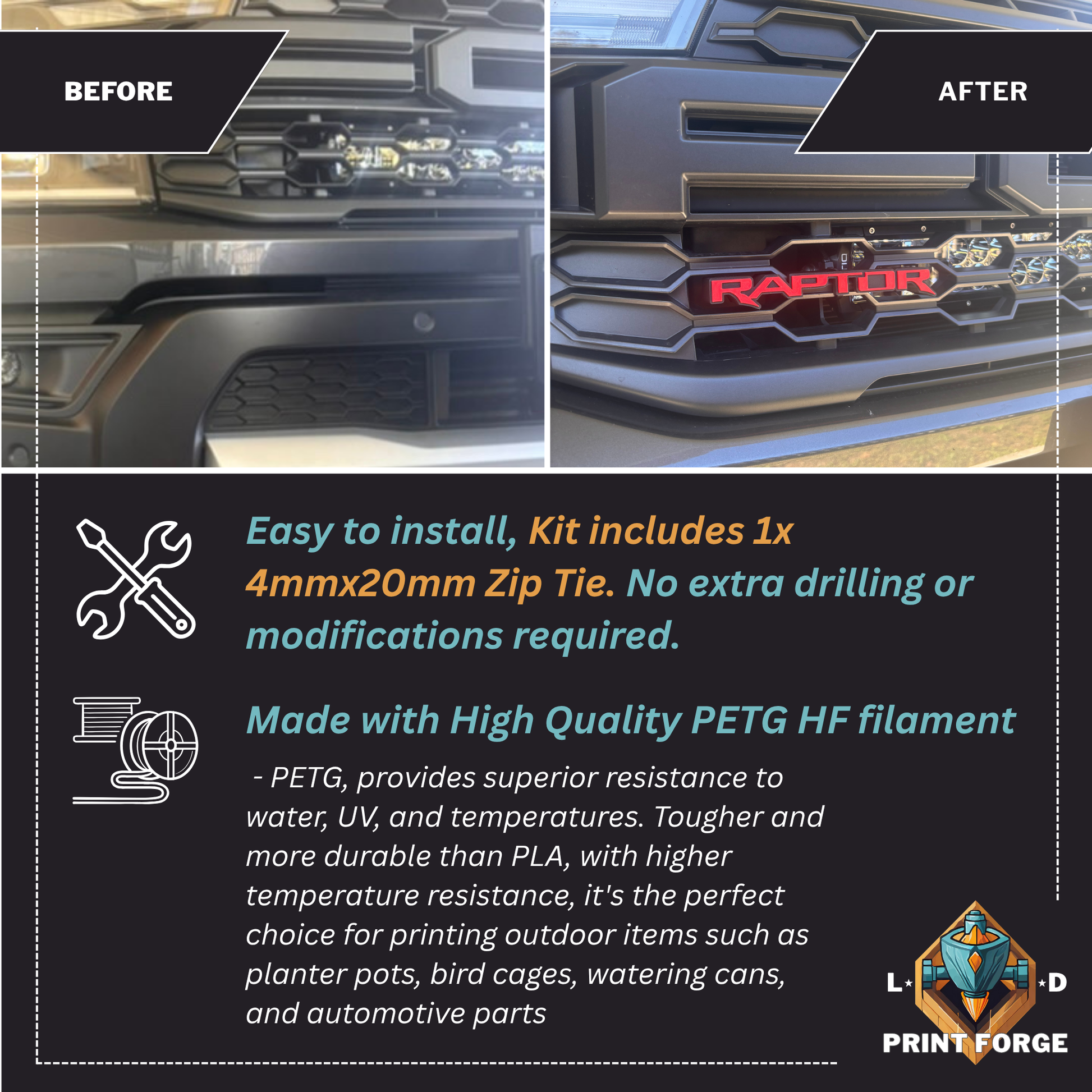 Each emblem is 3D printed in high-quality PETG HF plastic, chosen for its UV resistance and durability in harsh outdoor conditions. The contoured design allows it to mount neatly anywhere on the front grille, while integrated grooves hide the zip tie for a seamless finish.